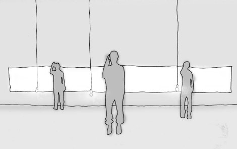 NLN’s set-design consists of 3 light bulbs (crown silver bulbs) hanging from three different points of the grid, forming a scalene triangle. The bulbs, hanged from the grid at approximately 1 m from the floor, are at the waist level of each dancer. One of the bulbs is hanged front stage (at approx. 1,50 m from front stage and, from the point of view of the stage, 40 cm off-centred to the right side) and the other two behind it, however, the one on the left side is placed 40 cm closer to the front stage then the bulb on the right. This light is complemented with conventional theatre light. See the sketch bellow.