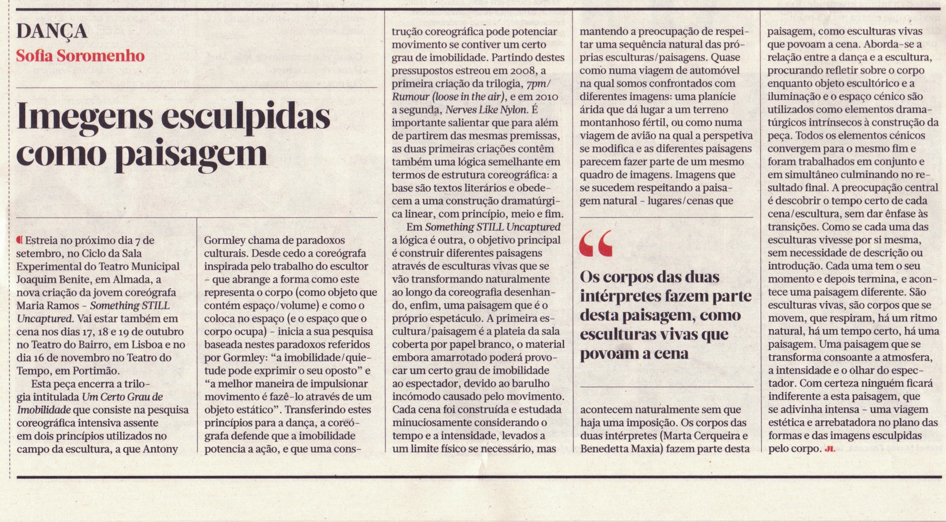 (ENG) (…) In an intimate atmosphere, Teatro do Bairro opened the doors to this performance where stillness as expression is the concept, and space is the body. (…) The visual load is dense and we feel emerging, just like a cloud in a dark space, sucked into a redemptive universe. As the basis of contemporary life, here we are transported to the abstract reality in which we live, from where, at the same time, we want to go out, but in doing so, it is the usual comfort that makes us return.